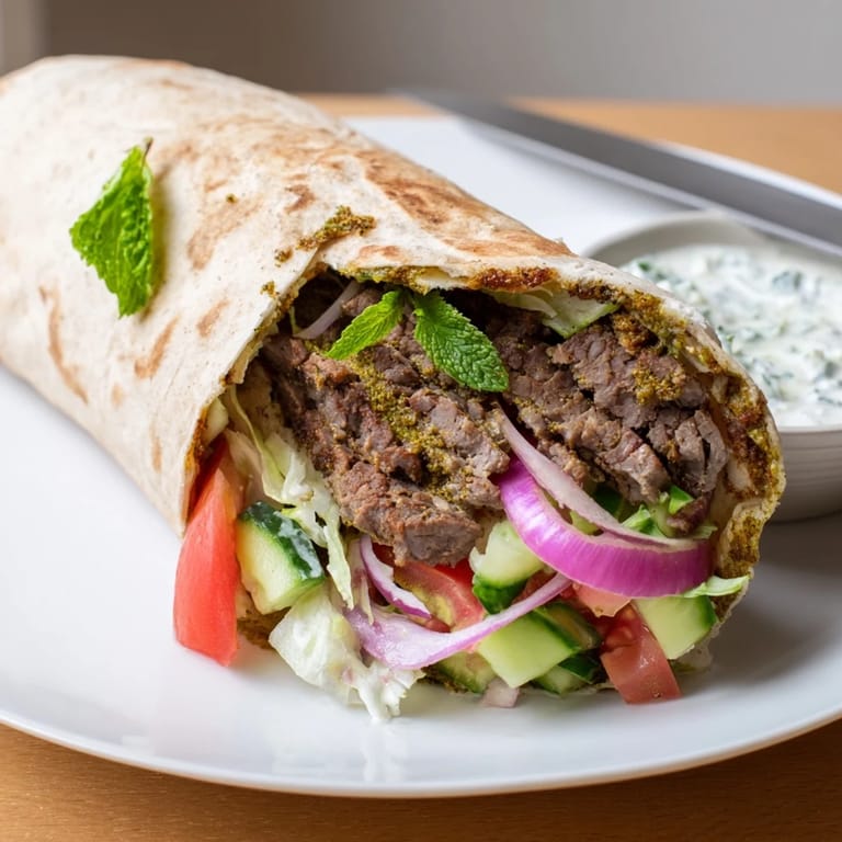 Save to Pinterest Tender spiced beef strips wrapped in warm flatbread with fresh vegetables and a tangy, creamy yogurt sauce—a Middle Eastern street food classic.