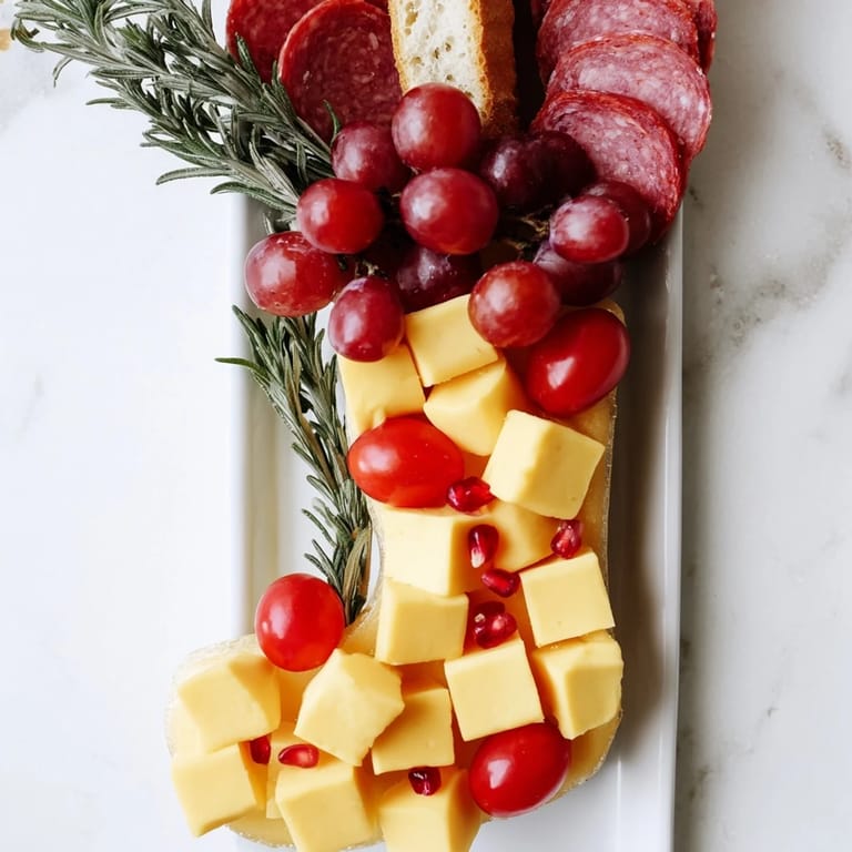 Save to Pinterest A festive and playful snack tray arranged in the shape of a Christmas stocking, perfect for holiday gatherings and easy entertaining.