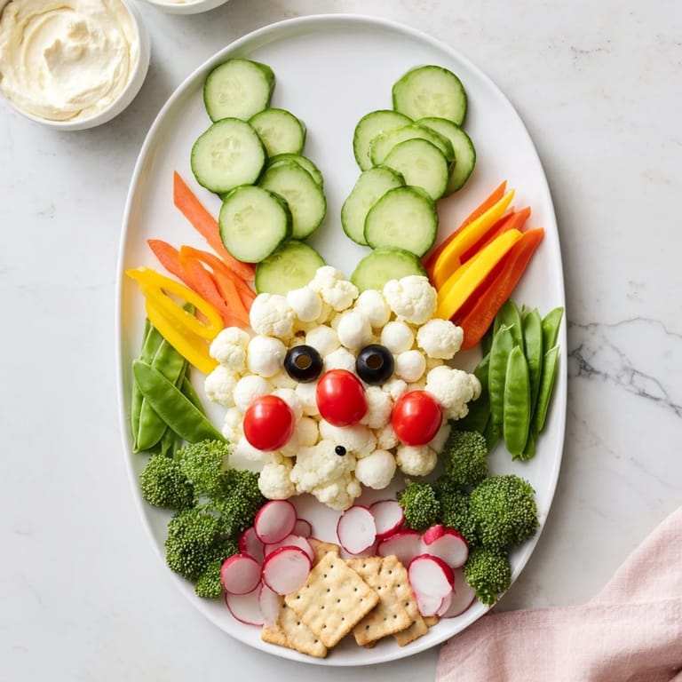 Save to Pinterest A festive and colorful platter featuring a charming bunny shape made with fresh vegetables, dips, and snacks—perfect for Easter celebrations and spring gatherings.