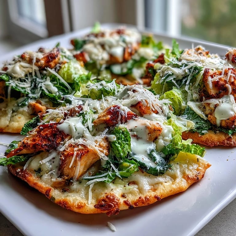 Save to Pinterest The beauty of these pizzas lies in their contrasting textures and temperatures. The naan bread gets crispy around the edges while staying soft in the center. The Caesar-dressed chicken brings savory flavors, while the romaine added after baking provides freshness and crunch. It's a harmony of flavors that takes minimal effort but delivers maximum satisfaction.