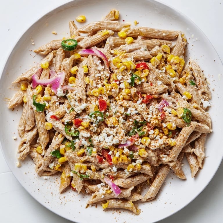 Save to Pinterest A vibrant and lighter twist on the classic Mexican street corn, this pasta salad combines charred corn, whole wheat pasta, creamy Greek yogurt, tangy lime, and fresh herbs for a deliciously satisfying side or light main.