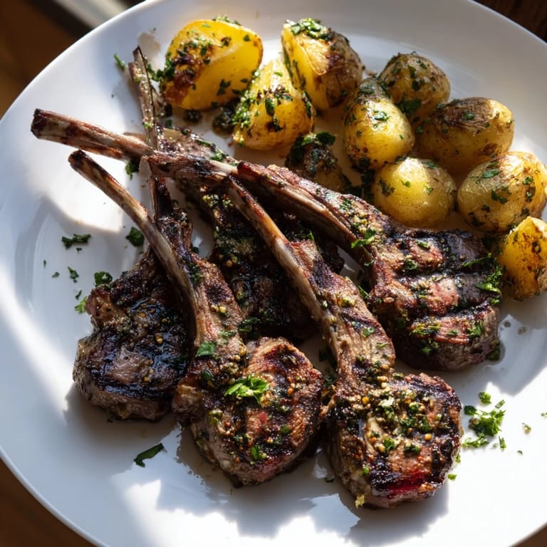Save to Pinterest Tender lamb chops marinated in fresh herbs, paired with crispy roasted potatoes for a satisfying and aromatic meal.