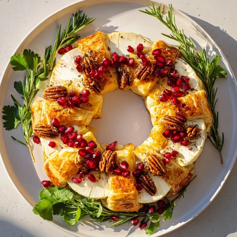 Save to Pinterest A stunning, elegant appetizer featuring creamy Brie, fresh pomegranate seeds, and aromatic herbs arranged in a festive, edible wreath—perfect for holiday entertaining.