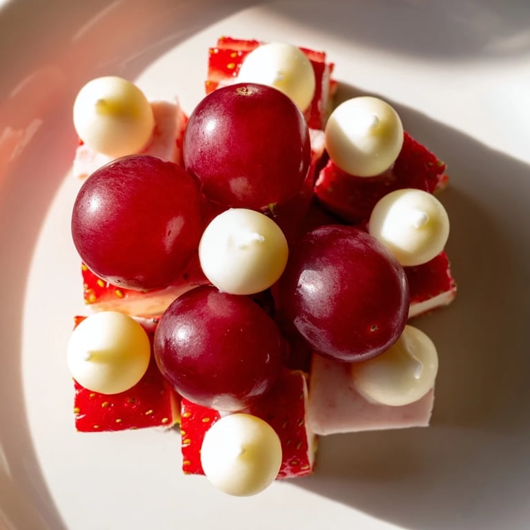 Save to Pinterest A festive and colorful appetizer featuring juicy strawberries, creamy cheese, and sweet grapes arranged to resemble Santa hats perfect for holiday gatherings.