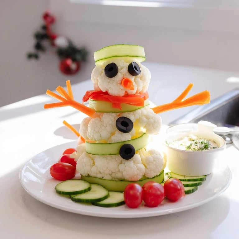 - On a large platter, assemble three cauliflower florets in increasing size vertically to form the snowman's body. Use cucumber rounds for the snow at the base. Add carrot sticks for arms, and carrot ribbons for the scarf around the neck. Use black olive slices for eyes and mouth, a small carrot piece for the nose, and bell pepper strips to create a hat and buttons. Place cherry tomatoes and remaining vegetables around the snowman as extra crudités.