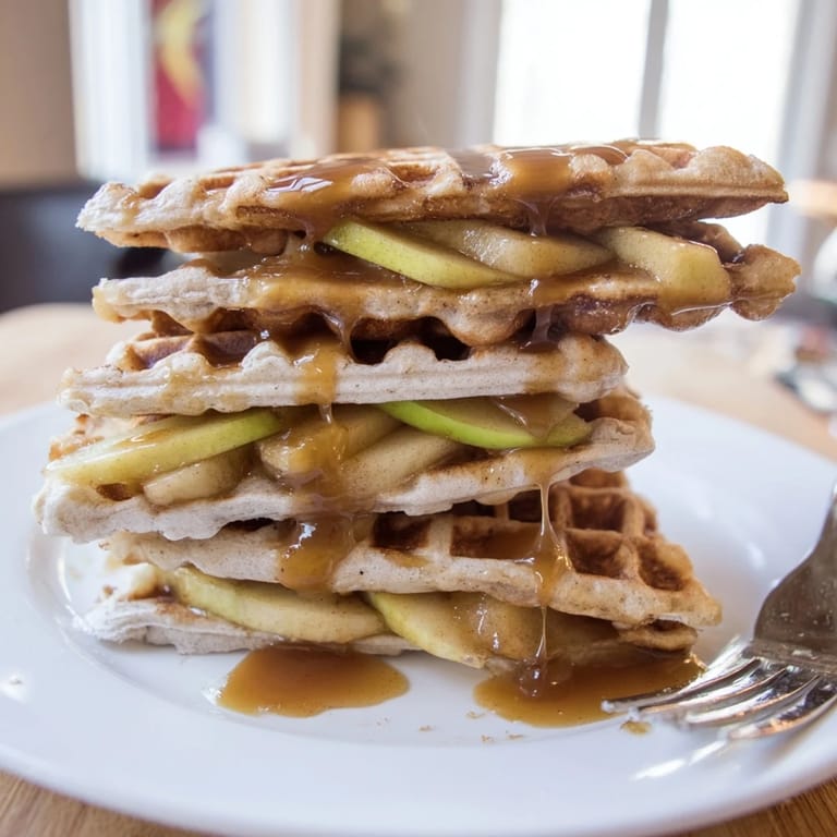 Save to Pinterest Golden waffles filled with warm caramelized apples and a drizzle of luscious caramel sauce—an irresistible handheld treat perfect for breakfast or dessert.