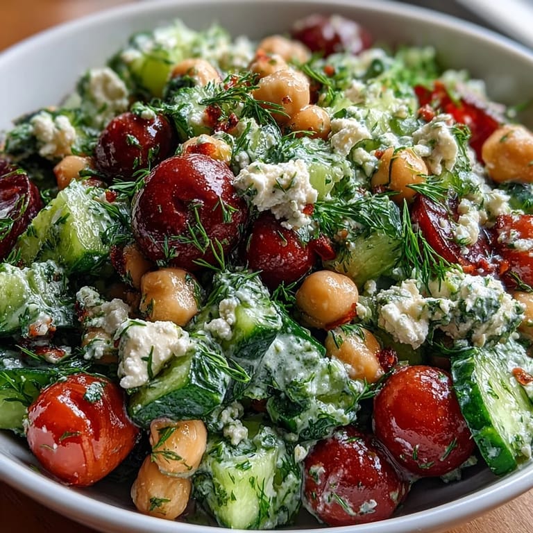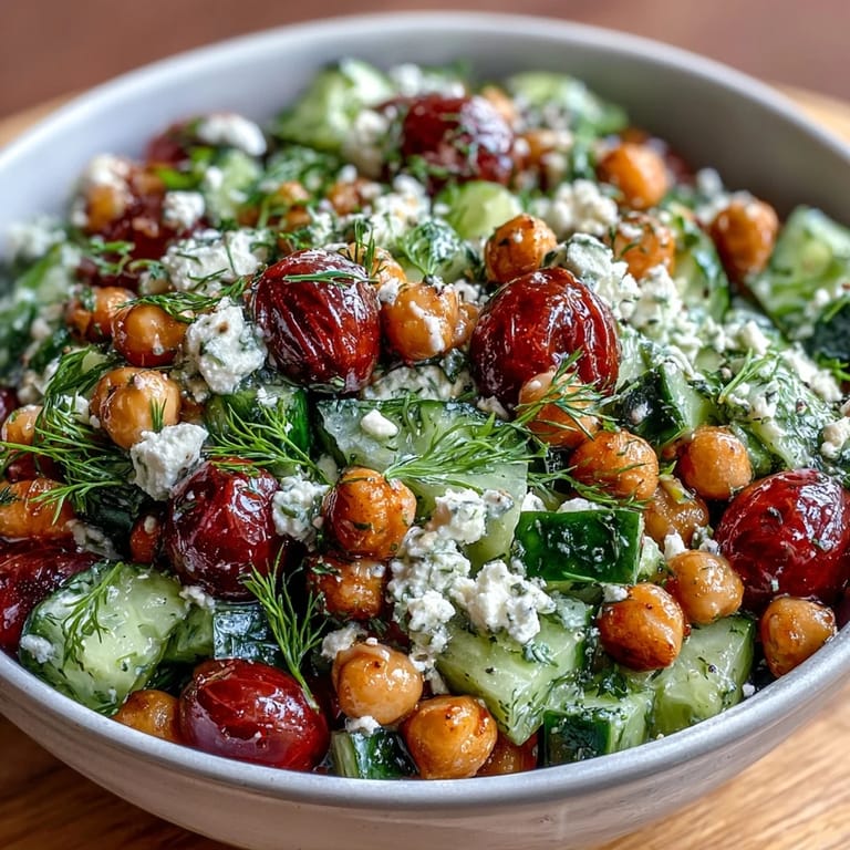 This vibrant Mediterranean salad combines protein-rich chickpeas, crunchy cucumbers, ripe tomatoes, fresh herbs, and creamy feta cheese. Tossed in a tangy lemon vinaigrette, it's perfect for a quick, nutritious meal. Prep takes just 10 minutes with no cooking required, making it ideal for light lunches or meal prep. Enjoy the fresh, balanced flavors and easy assembly that bring Mediterranean brightness to your table.