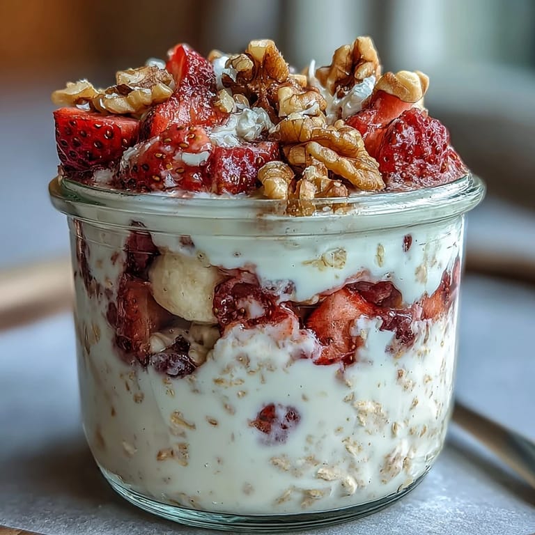 This recipe is incredibly adaptable to various dietary needs and preferences. For vegan oats, use plant-based milk and yogurt alternatives such as almond milk and coconut yogurt. If you have a nut allergy, substitute the walnuts with pumpkin seeds or sunflower seeds for a similar crunch without the allergen. Pecans or almonds can replace walnuts if you prefer a different nut profile. To boost the protein content, add a scoop of your favorite protein powder when mixing the base ingredients. For a chocolate twist, stir in a tablespoon of cocoa powder or add a handful of dark chocolate chips. Fresh blueberries or raspberries can substitute for strawberries depending on what's in season. If you prefer a warmer breakfast, the oats can be gently heated in the microwave for 30-60 seconds before serving.